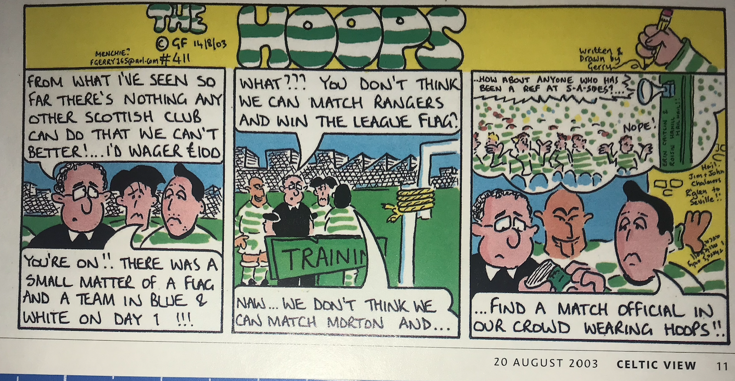 Unfortunately, in the same edition of the Celtic View as these two articles is a cartoon which has a chuckle about the inability of the Celtic crowd to produce a response to a Tannoy appeal for an official to take over the game – boom! boom!